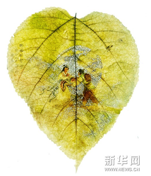这是8月12日拍摄的苏州艺人庞彦德制作的树叶烙画作品《鹊桥相会》。