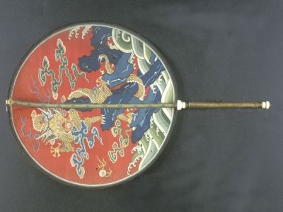 红色缂丝海水云龙图金漆嵌象牙柄团扇。