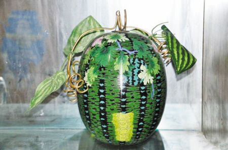 清代铜珐琅西瓜摆件 它看上去栩栩如生,宛如真的西瓜一般。其实,它只是清代出产的铜胎珐琅掐丝摆件。该摆件直径25厘米,高27.5厘米,看上去精美异常。铜胎掐丝珐琅其实就是明朝盛行一时的“景泰蓝”,因其在景泰年间传入故得名。清朝的铜胎掐丝珐琅技术盛极一时,尤其在乾隆年间达到鼎盛。以红铜作胎,在胎土上敷上白釉,烧结后用釉色彩绘,经过两三次填彩、修正,再烧结、镀金、磨光而成。清朝的铜胎珐琅,既有景泰蓝的厚重端庄,又有瓷器的明丽清雅,自成一格,别具风情。