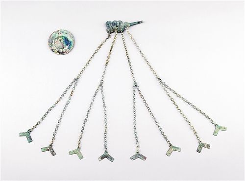 盒子里,4根青铜链条呈扇形铺张开来,每根链条从中部开始又一分为二,4根变8根,而小链条的尾端又镶有类似回旋镖图案的物件,晃眼一看,仿如孔雀开屏。