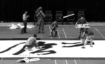 8月26日,临汾市书法家亢金马在布上创作了巨幅作品《大美临汾》。该作品高3米,宽11米,是用墩布在布上创作的,将中国传统书法笔法和现代绘画元素相结合,耗时4个小时。