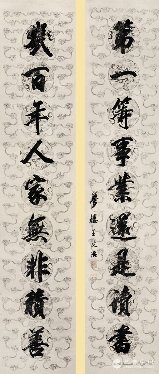 王文治 行书九言联 手绘团龙蜡笺 242cm×48cm×2