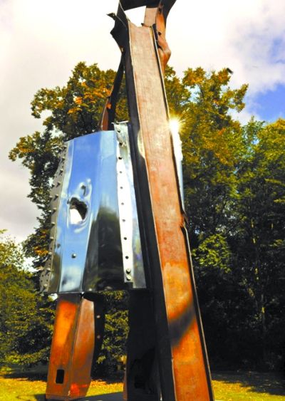 这座纪念雕塑高8.5米,由亚裔美籍设计师米亚·安藤利用世贸中心的大梁残骸设计而成。2011年,为纪念在9·11恐怖袭击中遇难的67名英国人,美国将这座雕塑作为纪念物赠予英国,但前提是该雕塑在伦敦某个著名地标永久落户。由约翰逊揭幕并命名为《9·11以后》的这座雕塑当时临时安放在伦敦南部的巴特西公园。但不久,雕塑就被移走,后因未能确定安放地,两年来一直被人们遗忘在英国东部剑桥郡的一个农场里,直到最近被发现雕塑早已锈迹斑斑。有批评人士指出,人们没有“充满敬意地”对待这件作品。