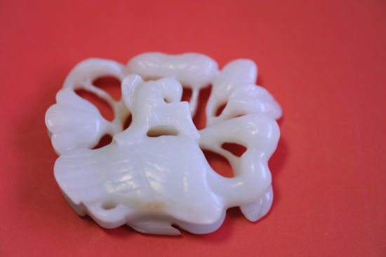 东西拿出来了,是件青白玉雕件,宽约5厘米,高约4厘米,厚1厘米的样子。细看,这是一丛荷,荷叶与荷花中趴着一只天鹅;天鹅的个儿较大,横贯整个雕件;一只海冬青从天而降,扑向天鹅,清丽的荷丛中海冬青在逞威。就内容看,这是一幅辽金的春水图,辽人常常以少胜多,以轻骑袭击中原的农耕民族,海冬青是辽人的精神寄托,是辽人的灵魂。