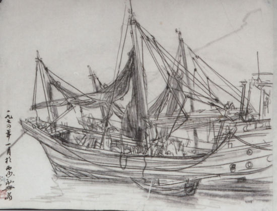 以往,黄胄先生的速写,主要以准确、生动、简练著称,而黄胄先生的这批南海、西沙写生,虽然,仍然保留了他以往善用认同、信仰古代绘画、古代石刻造型原则的心灵和眼睛看现实生活影迹的特征,但确实有了不同以往之处,这就是:有较多的对源自西方的光影造型的研究与应用。