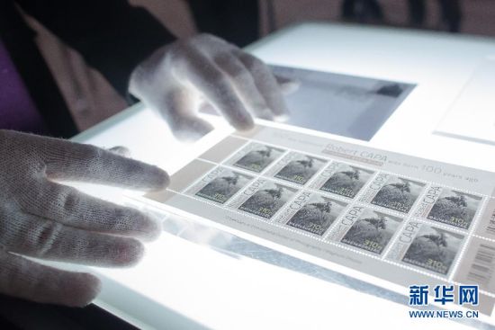 10月16日,在匈牙利布达佩斯民族博物馆举行的罗伯特·卡帕摄影展上,一名工作人员摆放卡帕纪念邮票。