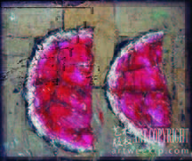 与此同时,钱培琛的绘画里反复出现马、鱼、仕女、苏州河等主题,代表着他对祖国和祖国文化的另类理解。古雅的、文学化的题材,比如“宫女”、“拈花”、“秋凉”、“大唐遗韵”……配以极其当代的媒介和手段进行表达,内容和形式之间的错位,形成了巨大的张力和不可解的神秘感。陈丹青2006年为钱培琛画展写的序言里称他:“由‘景’的抒情性描绘转向‘图式’的游戏,画面主题成为符号的设置,力求单纯”,并且“有节制地调理部分原始艺术的装饰性及行为艺术的随机性,使刻意安排与偶然效果同时奏效,寻求一种不再是绘画的绘画效果”。的确,钱培琛用综合材料“制作”的绘画,已经超越了“绘画”的界限和“美”的界限,是将中国的古典文化和杜尚“现成品”艺术观念的奇异嫁接和巧妙发展。钱培琛是一位思路活泛、融汇了东西方艺术语言的艺术家。他同时接受了东方文化和西方文化的熏染,并在东西方的艺术场域和语境里游刃有余,腾挪自如。他曾说:“在外国的学习让我在绘画上形成了一种自由开放的观念,也就是说,任何东西、任何方式都可以用来绘画。我们不必拘泥于内容和形成,因为我们不是这些东西的附录,而是我们在驾驭这些东西。最重要的是我通过它们找到了表达真实感情的途径。”