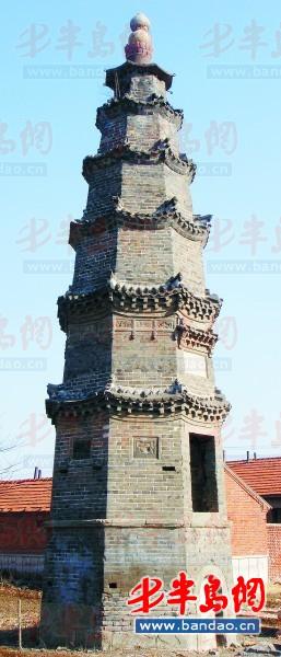 10月22日上午,记者在胶莱镇政府相关工作人员的带领下,来到了胶莱镇的西王益庄村,当听说记者是特意来采写村里的百年古塔之后,西王益庄村臧泽某、臧泽锡、白学业等几位老人特意赶来陪同记者参观百年古塔。记者了解到该塔共七层,八角,整座古塔高约13米。在当时一无吊车,二无现代化建筑设施的情况下,工人们是怎样把重达半吨的“石碾底和碾滚子”搬到塔尖上去的呢?至今无人知晓。