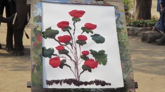 在网络上的一段视频中,我们可以看到,这头大象有条不紊的描绘着一幅红玫瑰丛。在训练员的注视下,她先是仔细的勾勒出花茎,然后一片片的画出花瓣。在场的参观者无不惊讶。