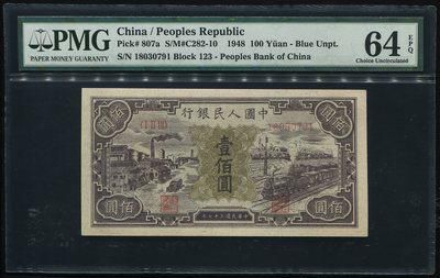 127532002第一版人民币工厂与火车100元一枚(ⅠⅡⅢ18030791、PMG 64EPQ)一元起拍,就这张纸币状态而言可谓完美,但因纸张等先天原因只评到64EPQ。