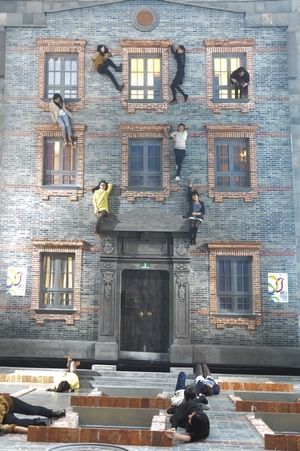 “石库门”是“反射的视觉幻象房子”系列在上海的最新版。它由一个真实大小的经典石库门建筑立面平放在地面,上方以45度角悬挂大幅镜面而组成的一个电影场景般装置。观众可以自由地坐站躺以及做出攀爬状和坠楼状,以求在镜面中表现出脱离地心引力的奇异景观。许多观众在上面忘情地摆拍、跳舞、搞怪,而在一旁的旁观者看来又十分滑稽。许宇说,“艺术家把要坠楼的一个瞬间提供给观众,观众利用这个可能性和场地能够进行很多诠释,这就像一个舞台,观众可以深入其境,莱安德罗完全把作品的后半部分交给了观众表演。”