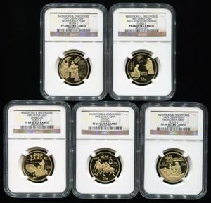 1997年中国传统文化第(2)组1/10盎司精制金币五枚一套(其中二枚实铸量:569枚、实铸量:579枚、实铸量:574枚、实铸量:594枚各一枚、NGC PF69)