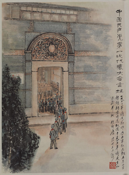 唐云的《中共一大会址》亦堪玩味,此画曾刊登于《南北画坛·中国近现代名家书画萃集》上。为唐云先生一九七○年国庆日作,一九七五年国庆重加点染而成。其时唐云身陷囹圄,却没放弃其惨淡经营了一生的艺术,政治上的不幸遭遇却使他幸运地拥有大量的时间和精力去潜心学习。所谓“笔墨当随时代”, 这一时期的唐云作品,引新题材新风貌入画,有着明显的时代烙印。唐云对此并不赞同,但亦不能幸免受到影响,比如用色开始趋向厚重浓彩,虽是特殊时期的一大特色,却也成为唐云一生画风中的一个独特面目。此幅所画的“一大会址”落笔谨慎,用笔较为细腻,是构图较为精致的精品。画中人物佩戴的红领巾是画中的一大亮点,细密的聚集在画中,如点点红星。整幅图有疏有密。细观皴擦、点染均能恰到好处。用色用墨亦淋漓酣畅,意境深远。
