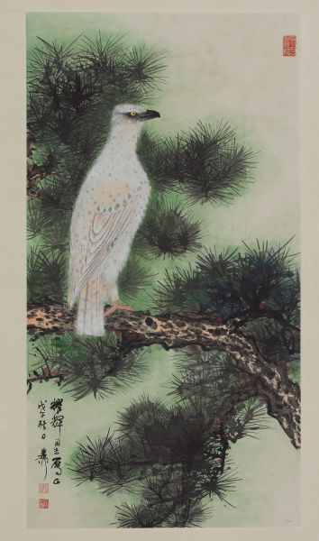 此次推出的“海派八大家”专题,谢稚柳的《松鹰图》尤其值得关注,画面中站于松枝上的白鹰应是鹰中之王,静穆而庄严地守护着家园和部落的成员们。画中之松谢稚柳运用了“落墨法”创作而成,关于“落墨法”可追溯五代时期的徐熙。谢稚柳在上世纪五十年多次关注徐熙的“墨落法”,史料见于谢稚柳《龙华寺白牡丹》、《桃花春鸟图》题跋。又有郑重《谢稚柳传》中记谢稚柳一九五四年写《水墨法》中对“徐熙落墨”做了详细的研究。可见此件作品在谢老作品中之地位。