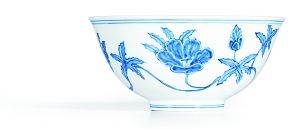 这件明成化青花缠枝秋葵纹宫碗,手感与众不同,“女子说它像新生儿的肌肤,男子则说像十八岁的少女”。该“宫碗弧壁圆滑,口沿微撇,隽秀蕴藉,犹如华葩半开。淡蓝宜漫抹,浓青善勒骨。外壁巧绘秋葵连枝,蜿蜒曲回。嫩叶有芒掩映花间……通体罩施釉料,透亮若脂,润泽如玉”。