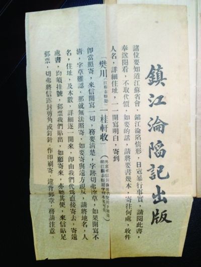 当年张怿伯为发行《镇江沦陷记》制作的邮递宣传单,上写:“……镇江沦陷情形,日寇暴行事实,请阅此书,奉送阅看,不取代价……”。