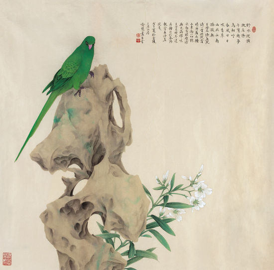与传统绘画一样,对大世界的感悟也应当是当代工笔需要表现的对象。这在1960年出生的喻慧身上表现得尤其明显。喻慧的艺术转型——或者不如说是她的艺术思想转型——发生在其四十岁左右。此前她笔下的主要意象是脉脉温情的闲花逸草、舞燕歌莺,一派小女人情怀,仿佛尘世与我何涉、万物与我何干;四十岁后,她开始将自己对外部大世界的观照抒写于笔端,转绘诸如磅礴的湖石、孤寂的莺燕、冷静而独自枯荣的花草等意象,此幅《绿鹦湖石》即可证此。