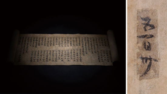 佛说不思议功德诸佛所护念经卷下,以30万起拍,就有多位藏家同时举牌,几经争夺最终以103.5万元成交。此书首尾齐全,纸质粗糙,为唐亡至五代归义军时期写经,15张纸,每纸长63.1cm。高26.1cm。全长九米五余,写后粘贴,有轴,一纸三十六行,行十六字。背纸有“仁平经”、“五百卅”等字。