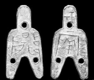 战国时期“下邲阳”背“十七·两”三孔布正面(左)与背面