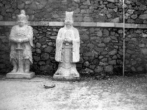 根据吴先生拍摄的石兽照片来看,石兽摆放在碧云寺金刚宝座塔北侧的“石翁仲”旁边。两只石兽并排放置,头高昂,张着大口,长舌伸至胸前,双目凸瞪,鼻头呈如意云状,耳大如扇,两侧有翼,前腿直立,后腿屈蹲,造型有些怪异,高约1米。北京晨报记者来到照片所述位置发现,一文一武翁仲尚在,石兽却不见踪影,放置石兽的底座也一并消失。一旁立着一块“石翁仲”的介绍牌,写着碧云寺曾为明朝天启权宦魏忠贤生圹,2005年9月19日,在金刚宝座塔附近施工时发现。