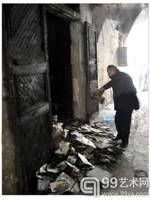图为相关人员正在检查在此次袭击事件中烧毁的典籍。