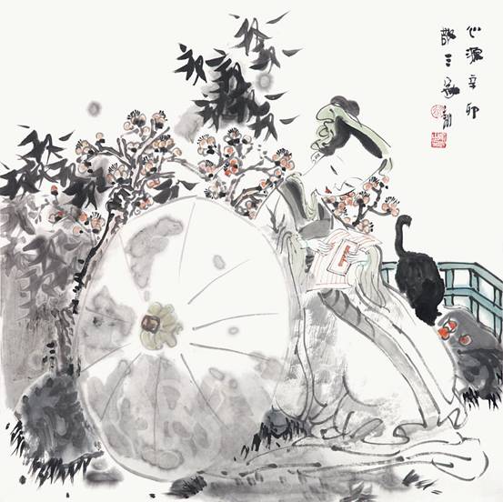 我们所处的这个时代,是一个技术泛滥的时代。王家训无疑具备了很高的绘画技巧,技术不会成为他表达思想的障碍。也许正因为如此,他反而舍弃了传统工笔人物画稍嫌匠气、工巧有余的描绘之法。他的人物画作品中,无论人物、景物都带有强烈的夸张倾向,笔墨轻松、意境超然,不事雕饰却已获得了传神写照的结果。人物的描绘看似随意,却个个特征明确、细节丰富、妙趣横生,表现出鲜明的个性形象和性格内涵。在人物造型上,王家训还吸收了较多民间造型艺术的特色。我们常说,在艺术发展的过程中。民间艺术始终占据着源的位置,因为它最贴近生活,也最能直接体现普通人的喜怒哀乐。对民间艺术的借鉴,使王家训的人物画透出一种质朴的美感。技巧也罢,风格也罢,都是附着于情感之上的,是画家内心活动的外化。艺术内核上的质朴与技巧的完美结合,是王家训人物画突显优雅和谐之美,体现无穷意味的基石。