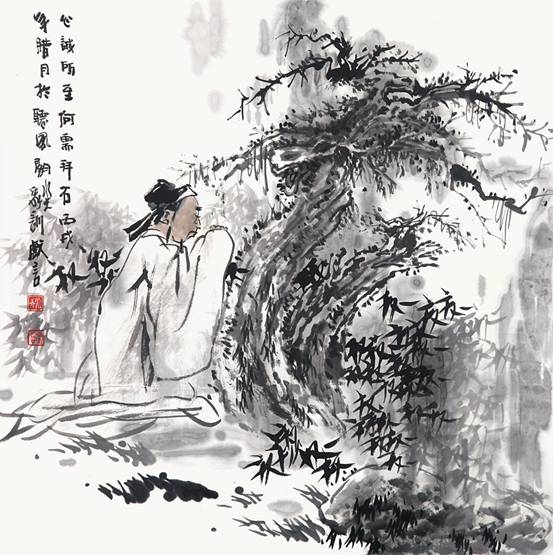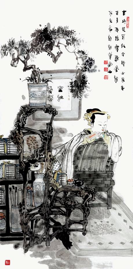 王家训的人物画有一种引人回忆的内涵,它表现的是一种穿越时空的记忆空间。透过它的抒情性、叙事性和神秘感,我们可以发现打动他的东西,同时我们又为这同一种东西所打动。说到中国画,总免不了要涉及到传承与创新的老话题。王家训曾师法任伯年和陈老莲,这体现了他的审美情趣和情感发展的某种脉络。但他深悟“师古而不泥古”之道,他的人物画作品充满古意,同时又处处透出现代气息,传承与创新得到了和谐的统一。任伯年的世俗情调和陈老莲的夸张谐趣在他的画作中都成了反映现代人审美情趣的精妙组成部分。王家训的传承体现的是把握了传统文化之后透出的一种文化气息,反映在作品中就是那种厚重的文化含量和现代感。