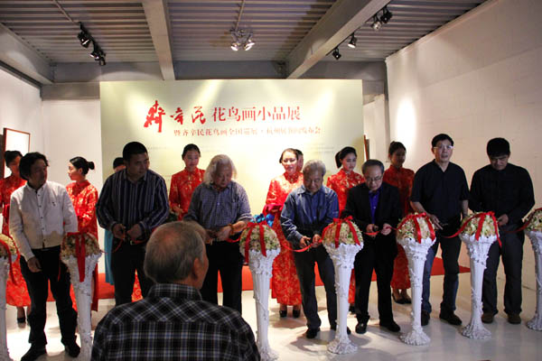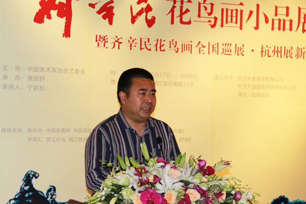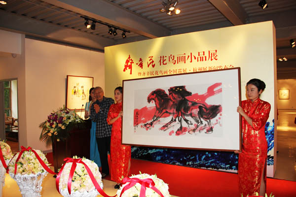 由中国美术家协会艺委会主办,微雨轩承办的齐辛民花鸟画小品展暨齐辛民花鸟画全国巡展·杭州展新闻发布会于2014年5月17日下午3时在微雨轩隆重开幕。浙江省美术家协会秘书长骆献跃,浙江省美术馆馆长马锋辉,浙江大学艺术学院副院长池长庆、中国美术学院教授、著名人物画家吴山明,浙江大学教授、著名山水画家杜高杰,中国美术学院教授、著名美术史论家任道斌、中国美术学院教授、著名美术理论家章利国,中国美术学院教授、著名花鸟画家沈岳、中国美术学院副教授、著名鉴藏家何鸿,浙江画院《中国画画刊》执行主编、著名花鸟画家罗剑华,浙江女花鸟画家协会副主席、著名花鸟画家邢鸽平,香港世界华商联合促进会执行会长刘永碧,香港华懋集团执行董事龚中心,香港《华商汇》杂志社总编夏雪,浙江涌金仓储股份有限公司董事长童天水等与来自全国各地的收藏家、书画爱好者一起参加了开幕式。开幕式由微雨轩美术馆馆长戴迎燕主持,骆献跃、吴山明、童天水先后分别发表了热情洋溢的致辞,骆献跃、马锋辉、吴山明、杜高杰、任道斌、章利国、池长庆为开幕式剪彩。同时,齐辛民向微雨轩赠送作品《俊马奔腾》。开幕式现场气氛热烈,到场嘉宾高度肯定了齐辛民在大写意花鸟画创作领域所取得的艺术成就。