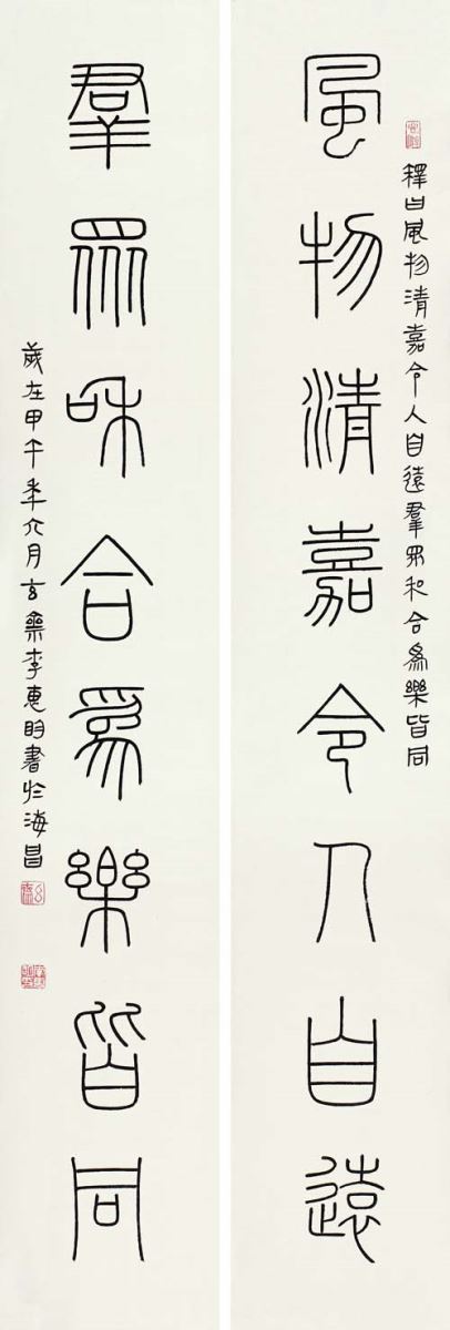 ↑《风物群众》对联 李惠明 书法138×23cm×2 2014年