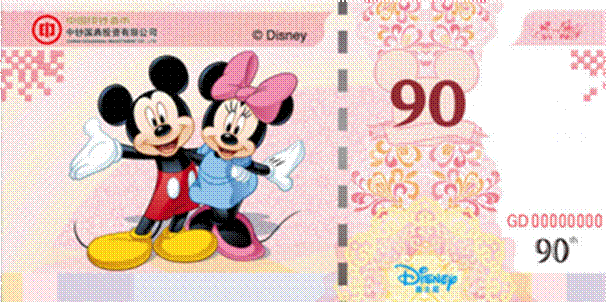 背景:为庆祝迪士尼公司成立90周年和迎接上海迪士尼乐园的开园而发行的,采用防伪工艺设计印制,市场增值前景无法估量。