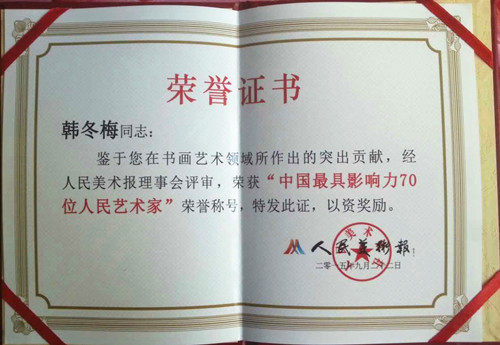 2011年10月荣获北京“中华魂”纪念辛亥革命100周年书画展中荣获金奖并授予《辛亥革命.共和书画名家》荣誉称号;
