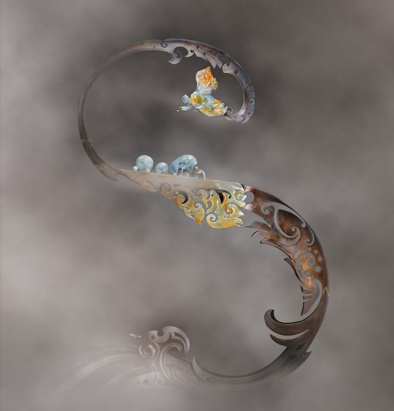 翡翠创作是被动的客观创作,从解读天意,解读翡翠中暗藏的玄机,巧妙地赋予文化思想与情感,金属部分则完全可以为人的主观思想而随意发挥。完全弥补玉在延展性的不足。金玉结合是主观与客观的真正融合,是完美的组合,是阴阳之互补,充分体现着天人合一之精神。王俊懿从十年前就已开始用各种金属与翡翠结合创作,并称这个系列风格为“翡翠金生”——翡翠与金属在当代的重生。翡翠金生得以穿越千年文化,发扬着民族精神,探索着当代翡翠艺术在中国文艺复兴的发展大道上,升华着地球上的宝贵物质与文明,金与玉在当代的新生。