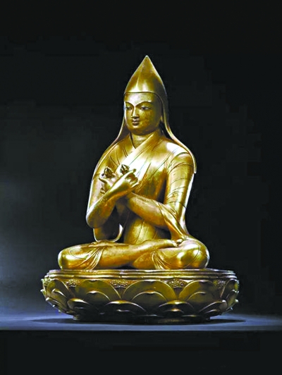 此像风格不同于清代西藏地区的造像,也不同于内地流行的宫廷造像,是流行于蒙古地区的一种造像风格,在所有的藏传佛教造像中特征最为鲜明突出。一世哲布尊丹巴是清朝四大转世活佛之一,法名“扎那巴札尔”。17世纪是一世哲布尊丹巴主导蒙古佛像造像的时期,许多佛像艺术品出自于他手。扎那巴札尔造像多以大持金刚、观音、文殊、弥勒、度母为主,而祖师像是极罕见的,铸造的大像更为稀少,这一尊祖师像是第一次出现。