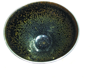 建窑又称“建安窑”、“乌泥窑”,以烧黑色釉瓷闻名于世。由于在宋代崇尚斗茶之风,故除了提供优质的茶叶之外,还要有最适于斗茶所用的茶具。建窑茶盏为文人们津津乐道,苏轼、蔡襄、黄庭坚都曾留下过诗文赞美建窑瓷器。宋人烧制的黑釉茶盏,极具艺术表现力,色如墨玉,彩如夜空,通过窑火的自然造化,在黑色釉面上产生铁结晶花纹,有鹧鸪斑和银星斑。有“银星斑”的茶盏后被称为“油滴盏”。此次天价成交的南宋油滴天目茶盏来自日本,十分珍贵。