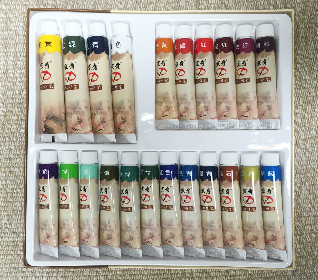 单支容量为12ml。其中,白色、藤黄、花青、草绿,为20ml大管包装。