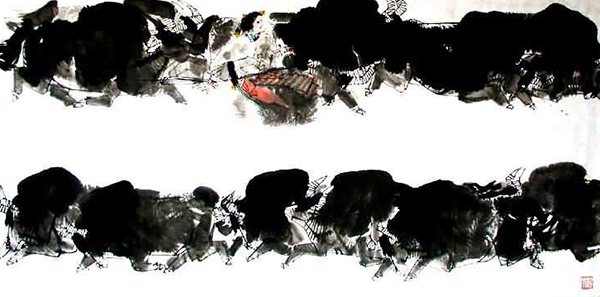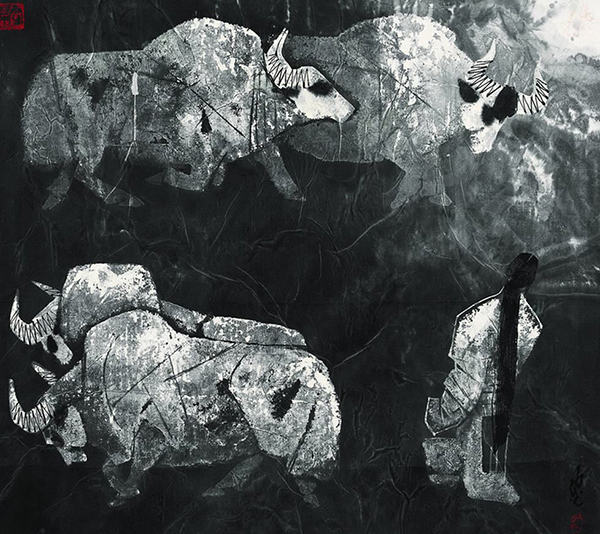 ③象征:象征是一种更深邃的暗示,是促使人生发更远更泛的比兴联想的暗示。象征物与被象征物之间常常没有特定的联系,只凭人的高级感受才可搭建桥梁。除上文说到的《琴声悠悠》以一行排列有序、贯月而飞的雁群,象征冬不拉的悠悠琴声外,我们从《月韵》中也可体悟音律之美。满幅是黑色基调(马西光很注意画的基调底色,往往以此统摄全幅),而月光则以其银灰的笔触,重重勾勒出一位背立少女的轮廓,她牧放的牦牛远远近近蜂拥行进于前,月光则在近处的牦牛身上烙上拓墨皴的印痕,而远牛只剩移动的淡淡的脊痕背影,渐远渐淡如烟。这是月光描绘的晚归图,也是月光谱写的一曲梦幻般的牧歌,读者听不到一点声音,也找不到画中谁在低吟浅唱,但心中充满着音乐感。