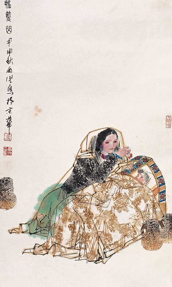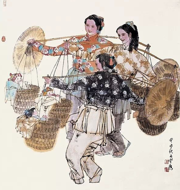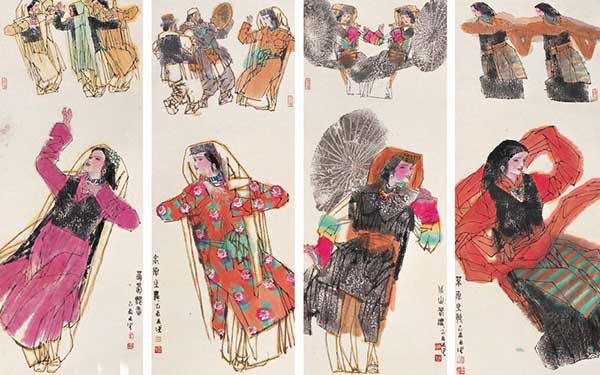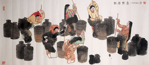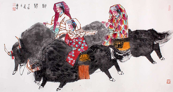 ②明示与暗示:明示也是暗示,因为画面无声。但人物形体动作如《拉伊声声》画一男青年手掩于腮作仰天长歌状;如《羌笛》画青年伏牦牛背向大漠吹送羌笛,一看便仿佛听到乐音。这和前项所述歌舞场面不同,如不是明示,读者亦可作他解。暗示是指人物通过形体动势所显示出来的节奏感,使人产生音乐的联想。如《酥油飘香》画五位藏女打酥油,或仰或俯,但双手持竿高度和向下用力之状,说明她们的节奏一致,人们会联想到她们是在唱着一首例如“打酥油”之类的民歌,用以统率动作的一致。又如《山道弯弯》画四个妇女挑担下山,山道已被“抽象”了,画家只凭人物耸肩、挪股、弯腿、抬足等不同的形体动作,暗示山道的弯曲,暗示她们正按照一定的节律在走路,也许都在哼着“过山谣”之类的民歌来统一步调。