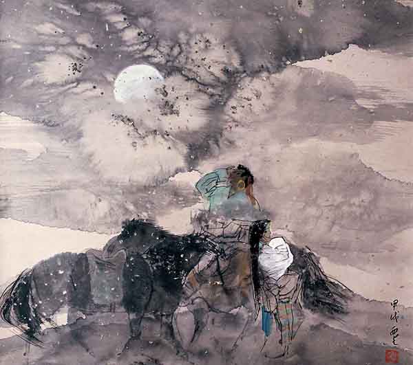 马西光大量运用拓墨皴法于牦牛、骆驼、毛驴以及人物的袍袖、马裤、胸膛,大大增强了这种种具象形体的质感、动势,强化传达了他对西部人物、动物、自然环境之粗犷、豪勇、奋斗、奔进的性格、气氛的感受和宣泄。其《湖水粼粼》,尤令我久久伫目惊叹,画面很简单,在全幅灰青色的衬托下,一位少数民族少女展开双手,扑向湖水。少女展开的白色裙裾,也像鹰翅一样飞动着罩向湖水。湖水,固然被他“抽”掉了,衣裙的皱褶也被“抽”掉了,拓墨皴法竟然把这幅宽裙布的质感、蓬松状,与少女双臂相对应、相协调的飞动感,都表现了出来。可见画家激活传统、创新发展的思维范畴,已经大大越出了“定向联想”的地步。他把西北风沙狂飞中的物象显影,适于拓墨皴的表现特色这一经验,扩大移用于水。当水沫和粼粼波光,泼洒、映照于布裙上时,也就显现了拓墨皴所能特别表现的那种斑斓散点而又迷蒙飞动的审美效果。《月朦胧》则通过拓墨皴,把月光的碎沫飞溅表现出来。