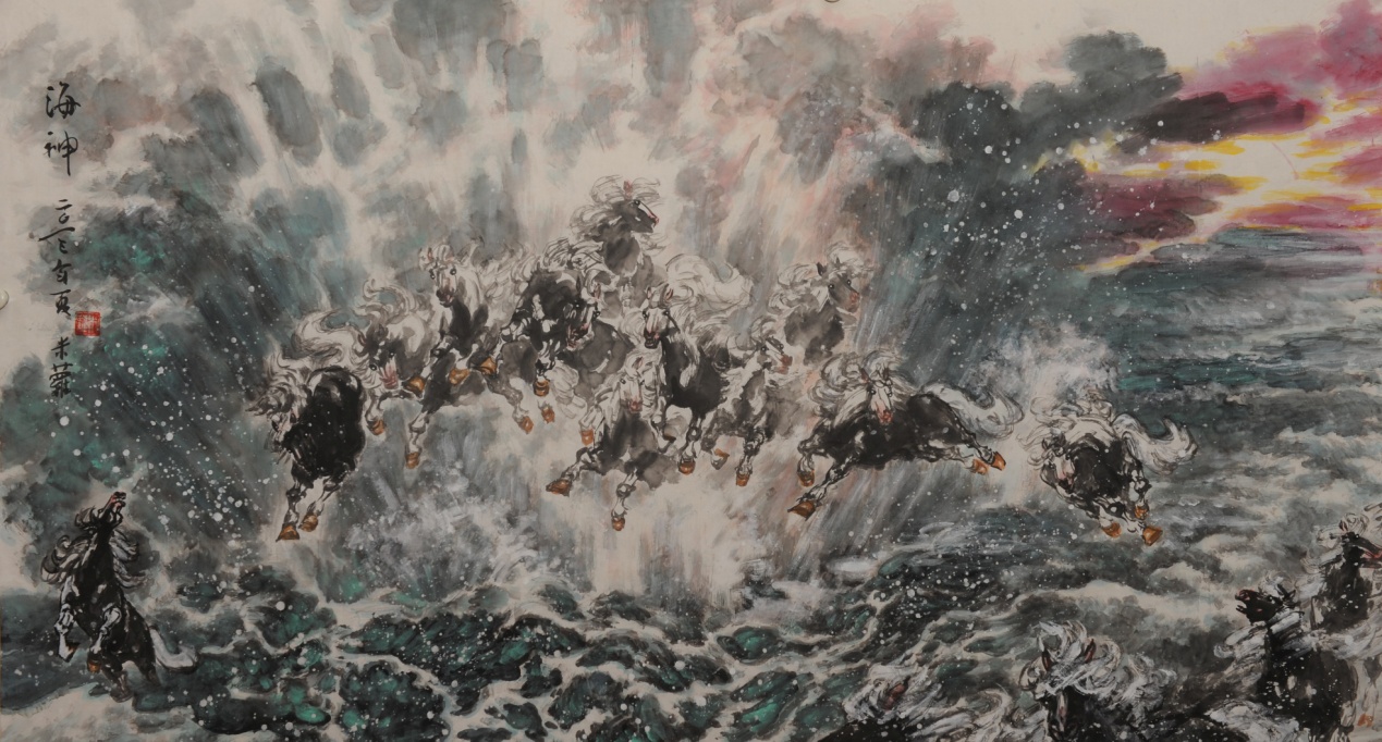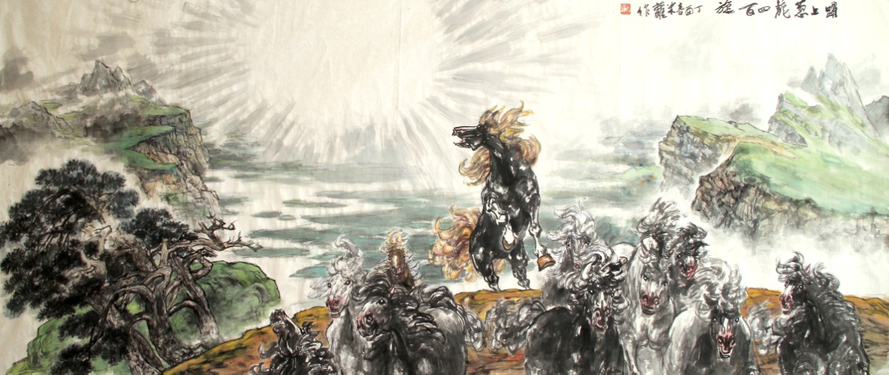 生于湘水一侧,濡染楚风巫韵;又得大山大水真气,成于白山黑水间的易洪斌,圈内人称之为新闻界通才,能诗赋,擅为文,精于办报,出版过多种著作,文、史、哲、艺兼修。遗憾的是,我读得不多。但是由其作品由其艺而知其文,知其人;亦如文如其人、书如其人、画如其人的道理一样。没有那些数十年积累的文化素养,也就难以有今天画马的出手不凡。而在语不惊人死不休、行不骇世亦未休的文化传媒空前发达、市场经济繁荣的今天,要想得到专家、领导、友朋同好间的溢美之辞,容易,可也并不真容易。“漫说北群空八骏、欲挽天河洗尘色。问何时,大象兮无形,耿星月”壮年正值人生瑰丽辉耀之际,易洪斌的《满江红》虽自谦为画马感赋,却透出壮怀激烈,壮心不已的汉唐情怀。事艺仅十年,成绩已斐然。如果易洪斌能够坚持读书读画、笔耕不辍,凭着他的智慧和对艺术的执着,自会更有一片璀灿的天地期许于他。相信易洪斌还有着更为高远的理想追求,以续写他的丹青骐骥精神。
