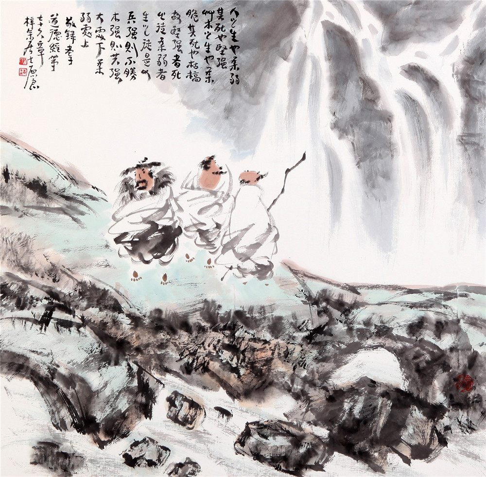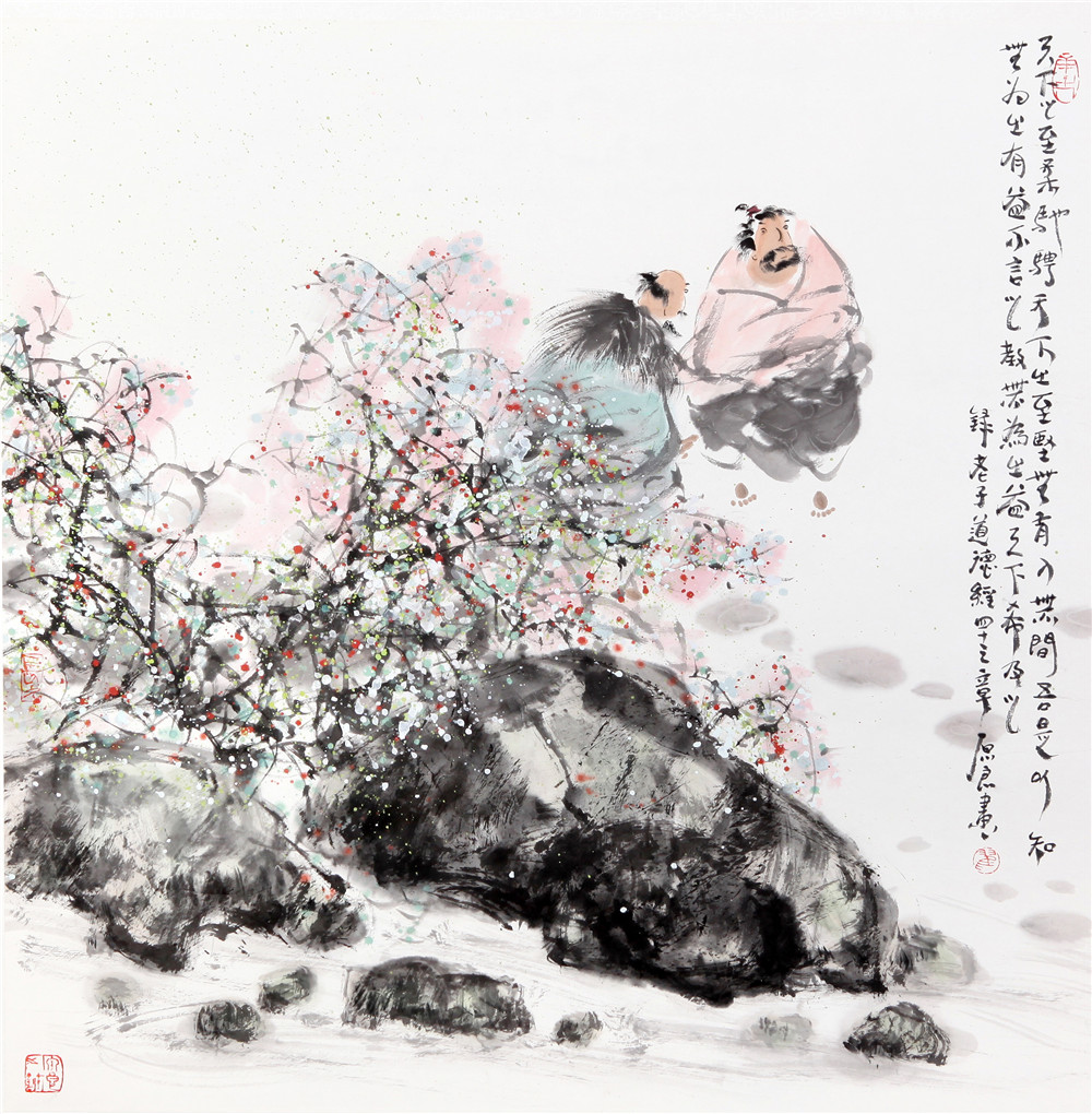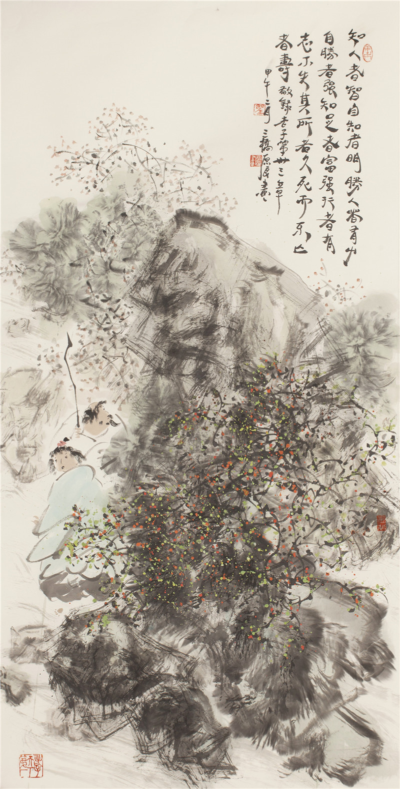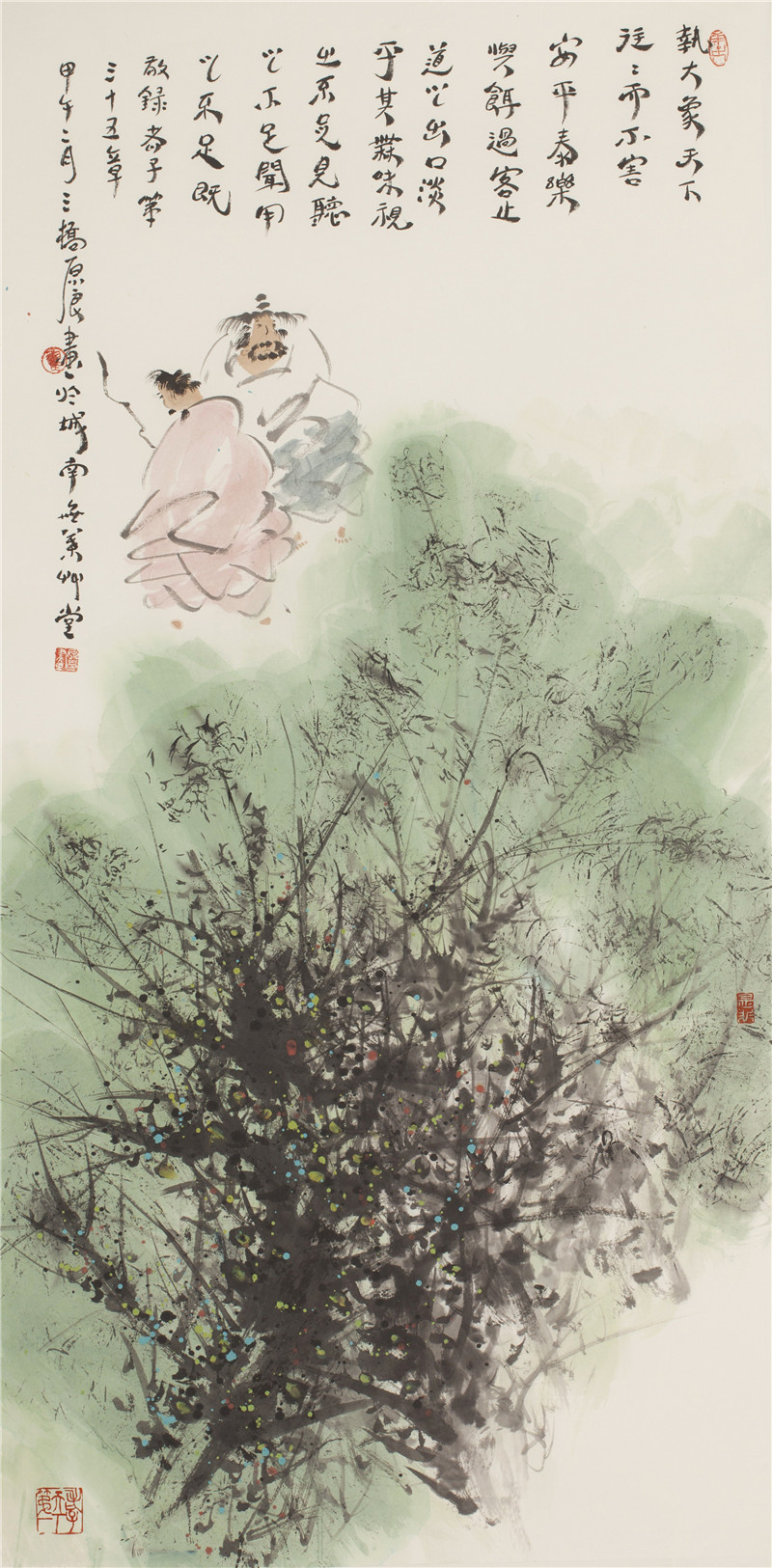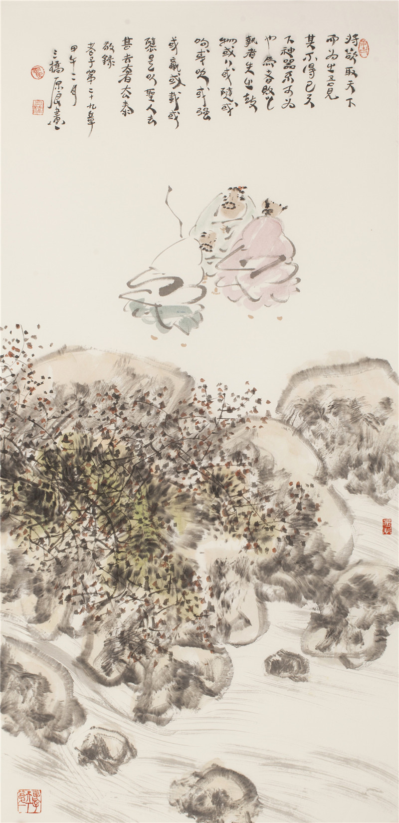 30年后,原良自已蔚然成家,成了一个画家、书画鉴定家的双料英才。近年原良的创作呈返璞归真之像,仍以大写意为主,却已别有一番意蕴。如果说中国画的精髓在于“外师造像,中得心源”,成熟期的原良画作已开始偏重心源的开辟和表达。有一个阶段,他的笔墨更加肆意和大胆,试验将多种现代手段揉进传统,如杂取漫画造型和装饰风格的线条色彩等;而他画的最多的,是被称为“道心禅意”的系列作品,满纸山水淋漓萧木纵横,一叶扁舟几个头陀,乱象中有静的平衡,庄严中透着几分滑稽。身为现代人,画家一味夸张地追模古人,仙风道骨,煞有介事,就成了一种戏拟和反讽,实是画家的一种表现,一种对现代生活的反思和认识。