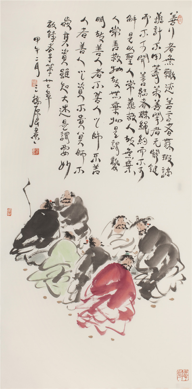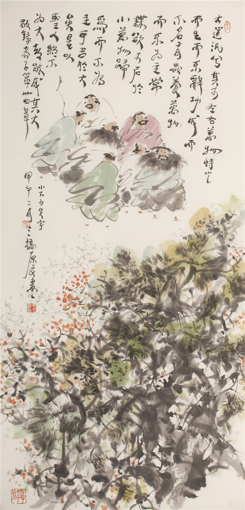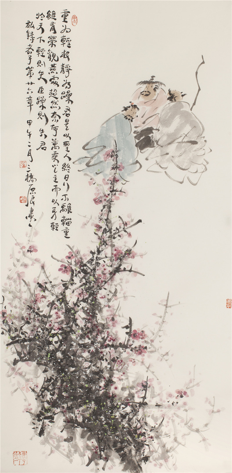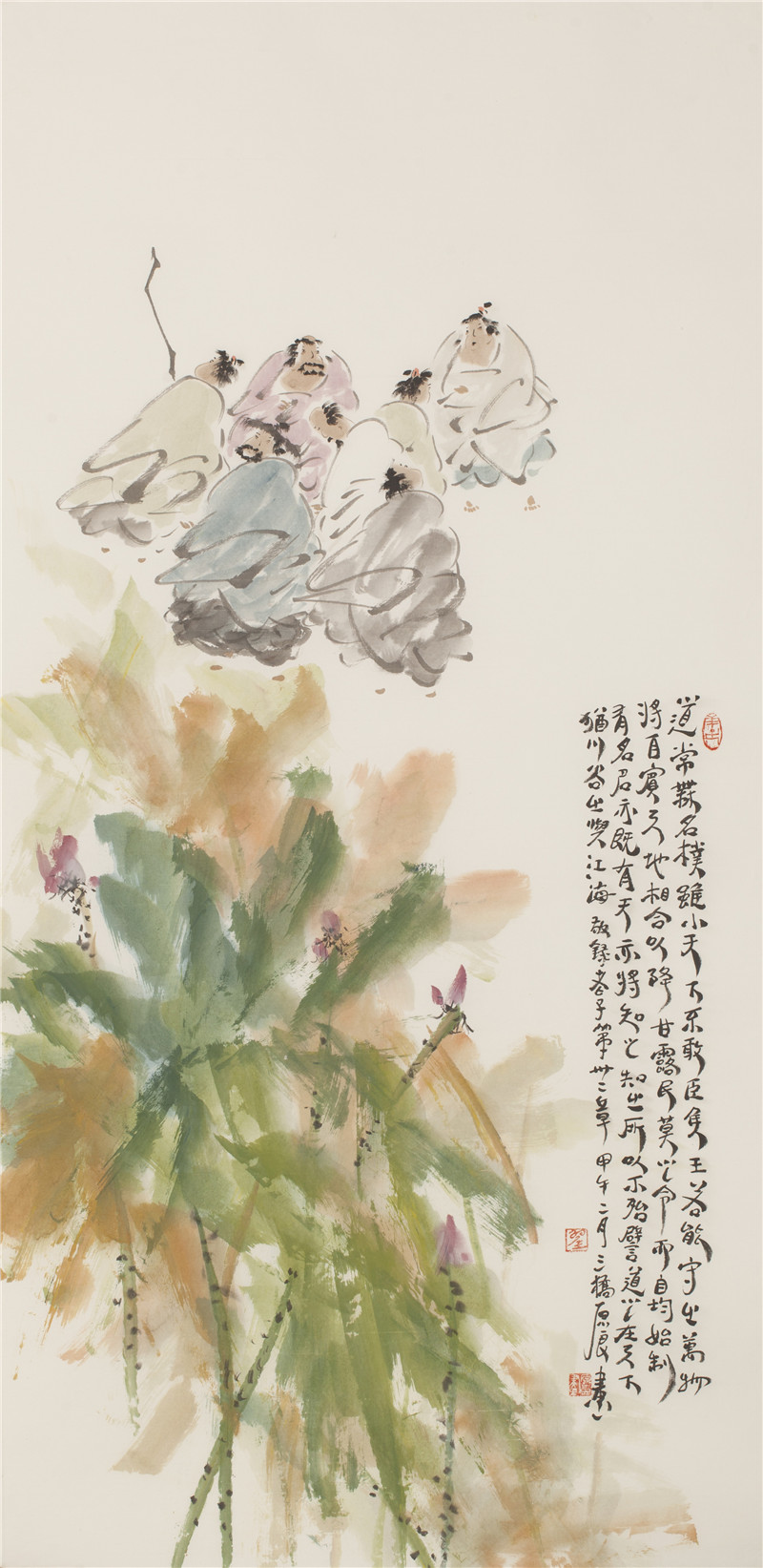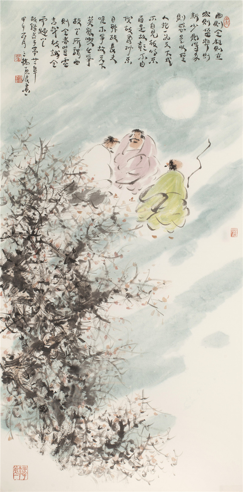 30年后,原良自已蔚然成家,成了一个画家、书画鉴定家的双料英才。近年原良的创作呈返璞归真之像,仍以大写意为主,却已别有一番意蕴。如果说中国画的精髓在于“外师造像,中得心源”,成熟期的原良画作已开始偏重心源的开辟和表达。有一个阶段,他的笔墨更加肆意和大胆,试验将多种现代手段揉进传统,如杂取漫画造型和装饰风格的线条色彩等;而他画的最多的,是被称为“道心禅意”的系列作品,满纸山水淋漓萧木纵横,一叶扁舟几个头陀,乱象中有静的平衡,庄严中透着几分滑稽。身为现代人,画家一味夸张地追模古人,仙风道骨,煞有介事,就成了一种戏拟和反讽,实是画家的一种表现,一种对现代生活的反思和认识。
