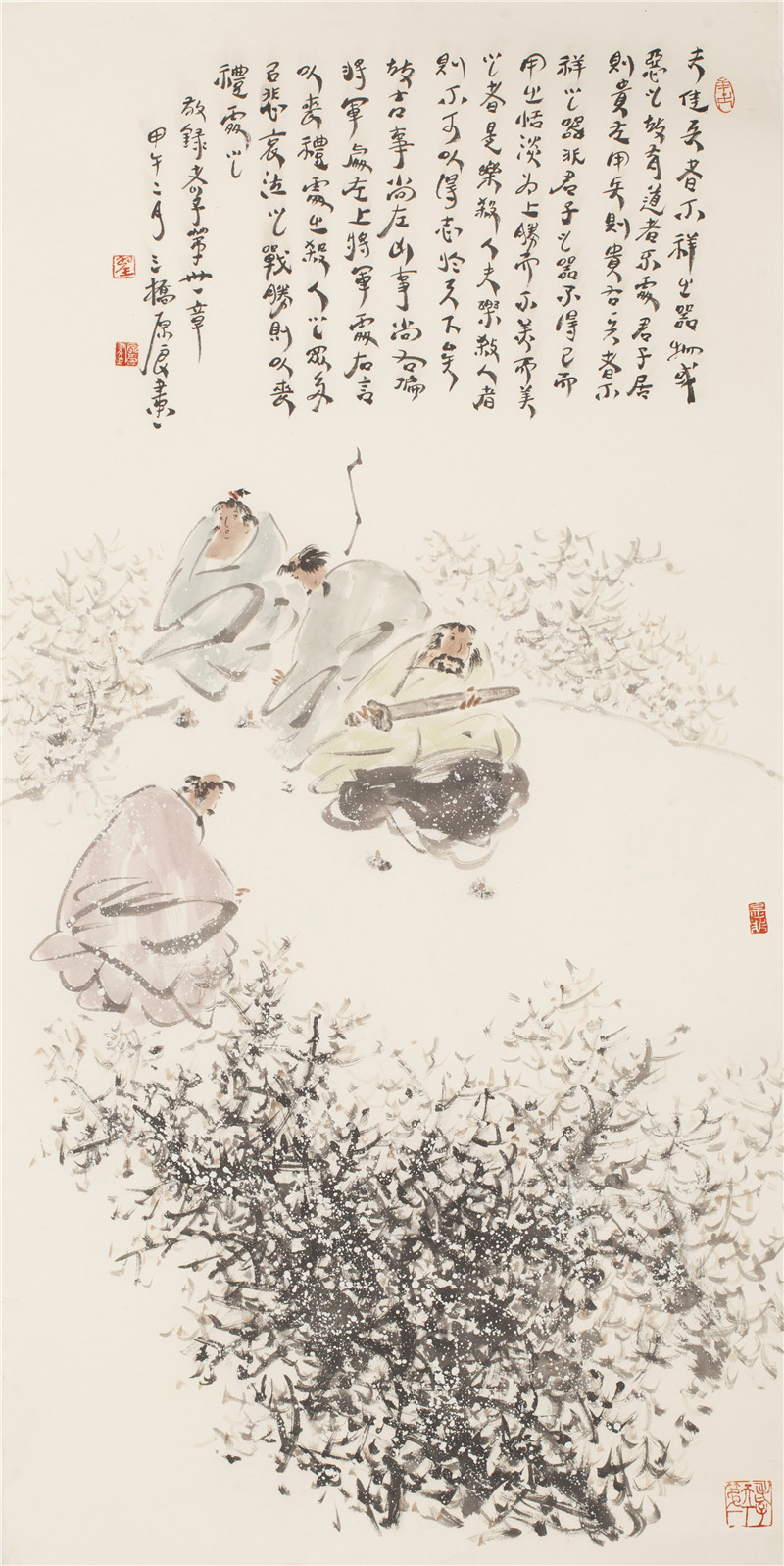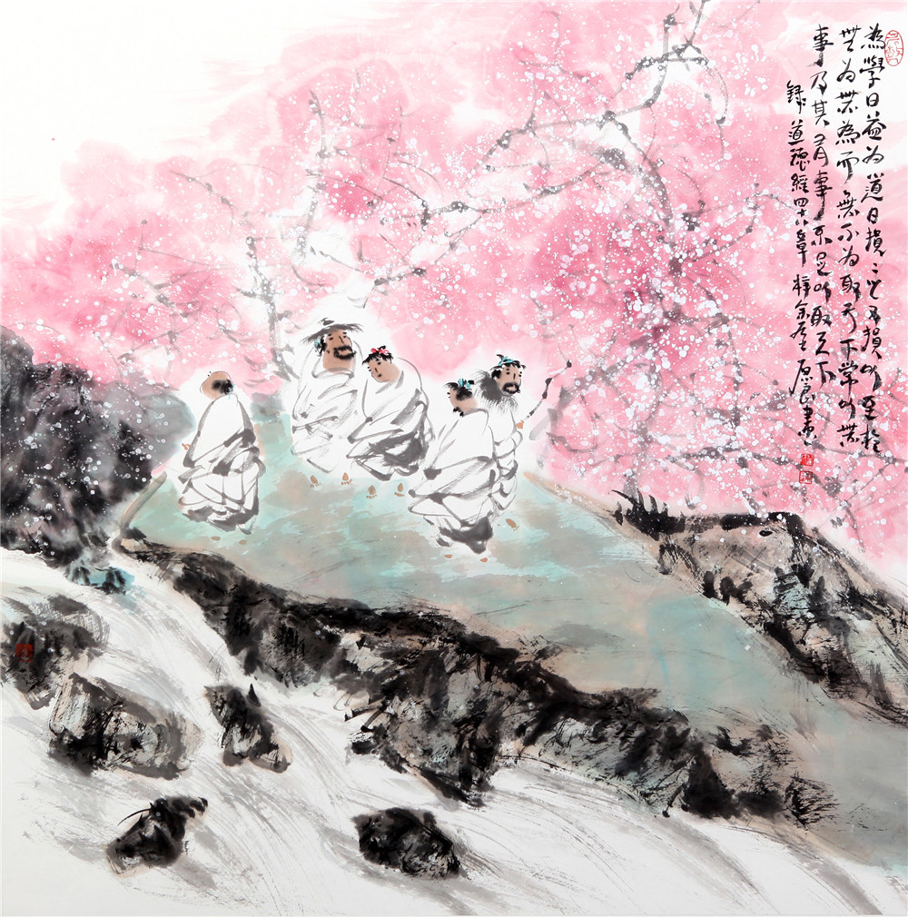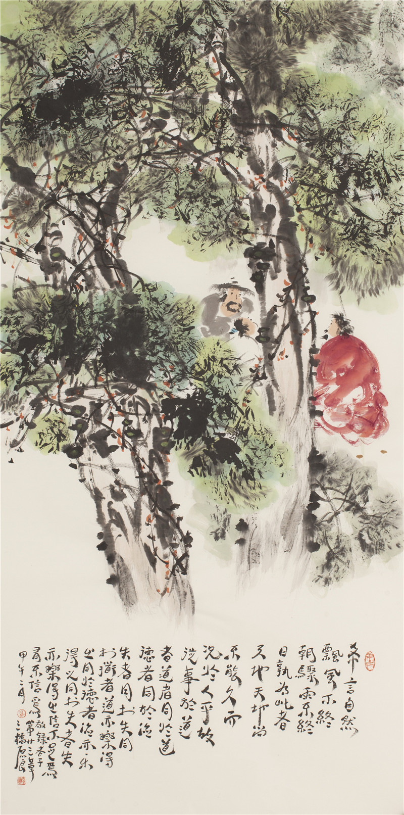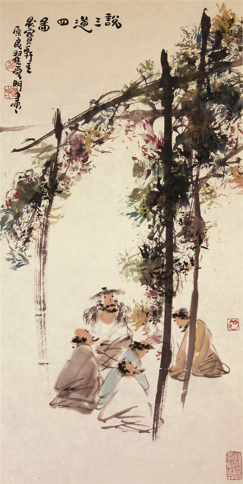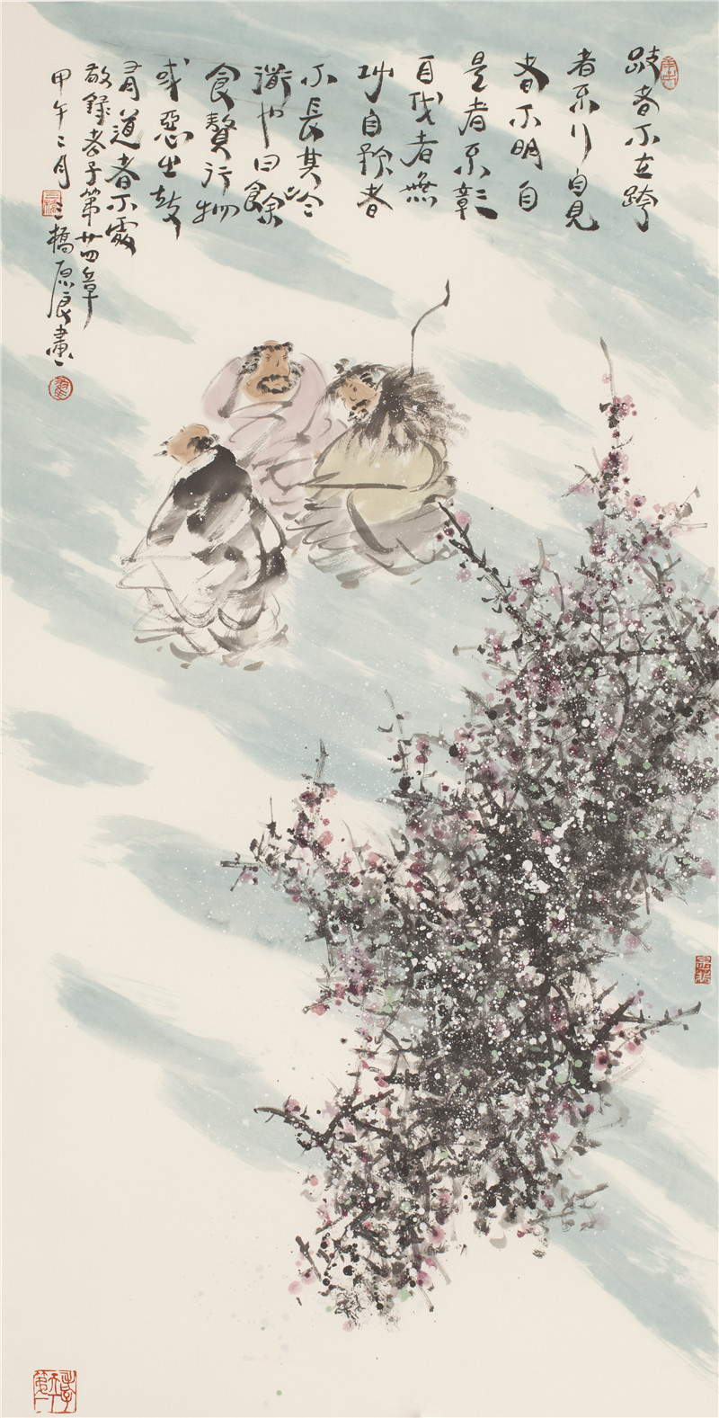 30年后,原良自已蔚然成家,成了一个画家、书画鉴定家的双料英才。近年原良的创作呈返璞归真之像,仍以大写意为主,却已别有一番意蕴。如果说中国画的精髓在于“外师造像,中得心源”,成熟期的原良画作已开始偏重心源的开辟和表达。有一个阶段,他的笔墨更加肆意和大胆,试验将多种现代手段揉进传统,如杂取漫画造型和装饰风格的线条色彩等;而他画的最多的,是被称为“道心禅意”的系列作品,满纸山水淋漓萧木纵横,一叶扁舟几个头陀,乱象中有静的平衡,庄严中透着几分滑稽。身为现代人,画家一味夸张地追模古人,仙风道骨,煞有介事,就成了一种戏拟和反讽,实是画家的一种表现,一种对现代生活的反思和认识。