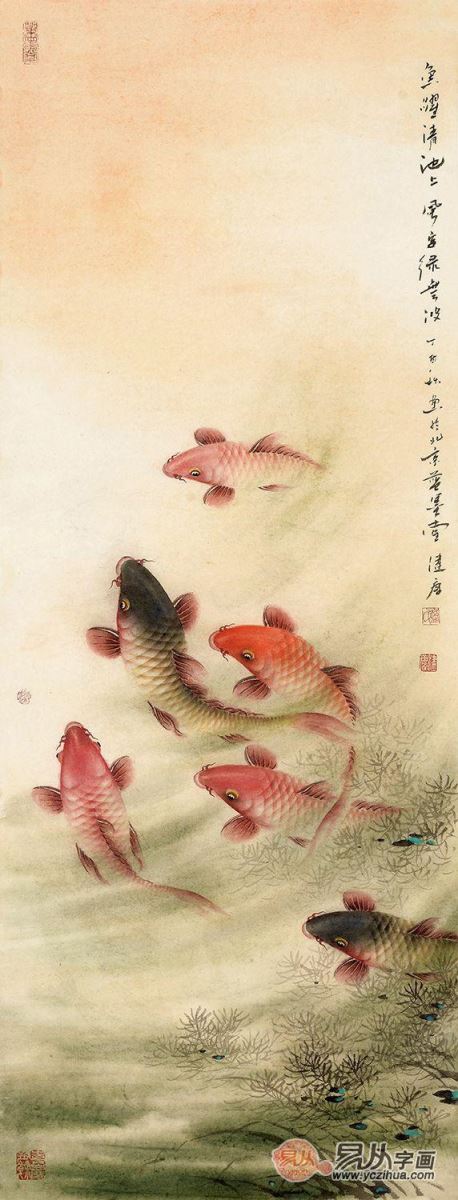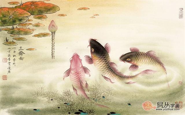 鱼在国画中是很常见的题材,其中又以鲤鱼为主,“鲤”同‘利’,“鱼”同“余”,寓意财运旺盛,年年有余。鱼中又有三、六、九之数,一生二,二生三,三生万物,寓意生生不息,源源不断;六有六六大顺,事事如意;九为长长久久,富贵长久之意,都有财运亨通,吉祥如意的寓意。