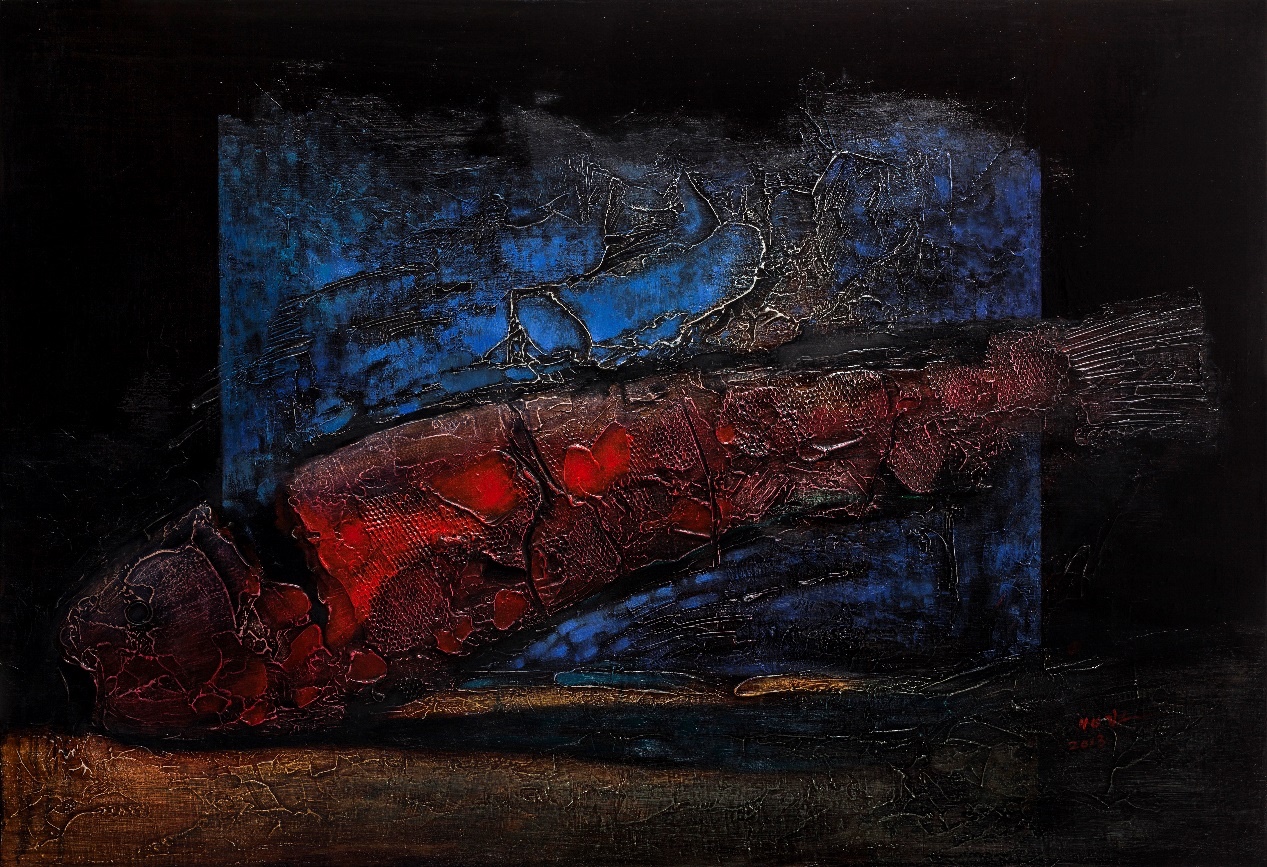 本次的展览主题——“北水无形”,主要展出了艺术家北水创作的“鱼”和“罂粟花”主题系列作品,包括了油画、漆画、版画、装置等在内的多种表现题材与材质,作品多以个体生命对生命的内在感受为主线,以鱼作为图式符号或直接以油画材质本身的物性和单纯的色彩表达对生命的敬畏、关爱、无奈……,画面厚重、忧郁、诗意,直指生命本质。