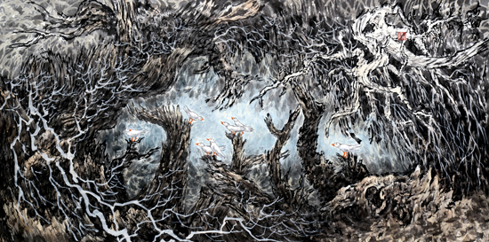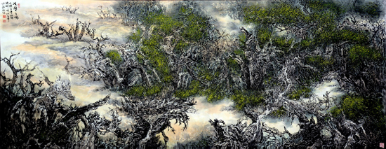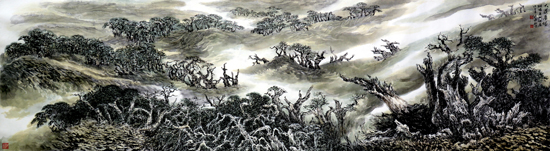 数年来,他穿梭于胡杨林间,潜心积累,反复探索。其胡杨画气象雄魄、意境高远。他运用水墨简朴、素净、率性、本真的特性,表现胡杨独特的品格。他的胡杨作品《洗礼》、《苍龙抱月》墨色苍劲、姿态张扬、浓淡相宜,层次清晰、富有纵深,形神兼备、气韵俱盛,将胡杨不屈的生命张力以及生死强烈对比的生存环境,表现得酣畅淋漓,具有极强的视觉冲击力。他用独创的皴法勾勒、描绘胡杨奇异的生存状态。他先以遒劲的线条,勾勒胡杨枝干骨架。然后,区别对象,在留白处运用各种皴法加以不同的皴擦渲染,将老与新、枯与荣、死与生各种状态胡杨的肌理、质感、天然野趣,刻画得栩栩逼真。这是他在笔法技巧上对林木画的突破和贡献。