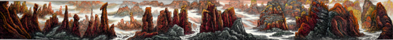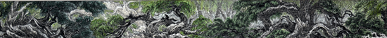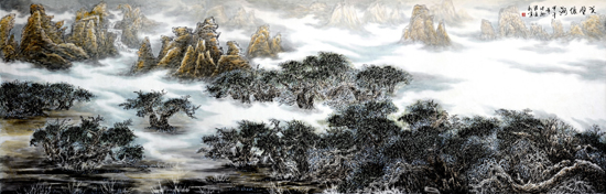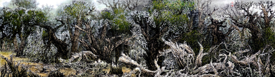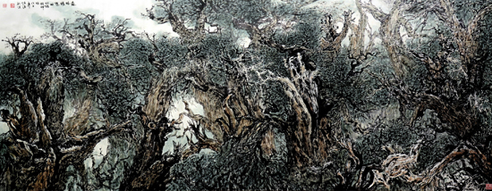当年荥阳焉有今日之繁荣?然而,在电影公司从事美术专业的张凌超,凭借银幕上无所不包的信息量,其视野遍及中外,已非一般作者可比。凌超的山水画,取法乎上,一入手便技高一筹。在我后来发起的22年世界五大洲巡展活动中成为骨干作者,每年走进一个国家,在各国深受好评。在这项以世界和平为主题的公益活动中,张凌超山水画作出了突出贡献。他什么时候因何缘由开始画胡杨,我不得而知,但是,我第一感觉便是“理所当然”。因为我深知凌超其人朴实无华而又刚强自在,应该是同胡杨深交已久的知音了。