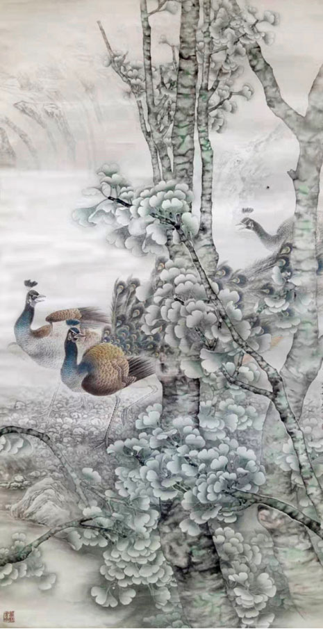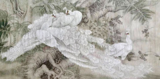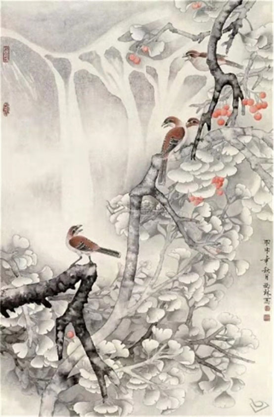 工笔花鸟画自两宋已臻精丽,元明为大雅之正朔,至近现代工笔画又有长足进展,可谓旧题新典。诸如于非闇、陈之佛、张大千、何家英等诸贤俊彦都是他法乳之资,且小囿于此,凡有营养,尽管拿来为我所用,除了传统中的三矾九染之外,不仅吸收了南方画派的撞水撞粉,并且融合了山水画的某些皴擦,还有清末恽南田的没骨法,其倩华淡约,俊润秀逸,就巧妙地被其吸收在他的工笔花鸟画里。