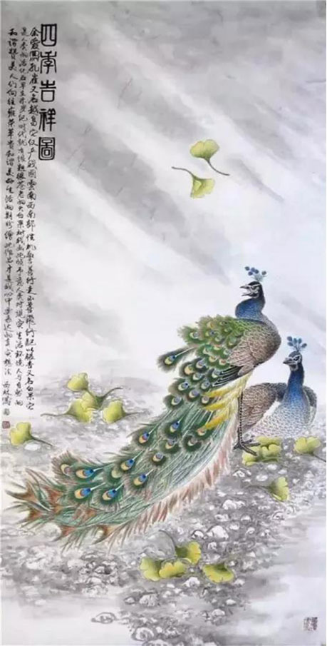他的构图,又有另一番景象。即传统又现代,繁而透,空而灵,动静结合,素艳得宜。大多以斗方形式出现,很合适现代建筑装潢的风格。