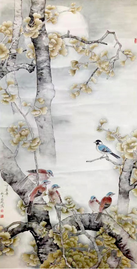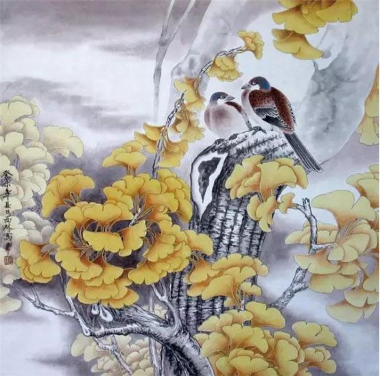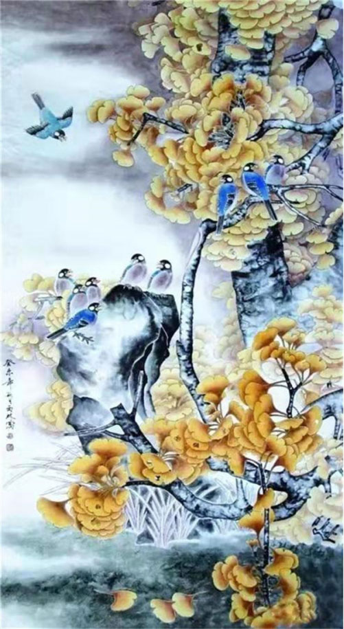 大凡数百年的银杏树下都会披红挂彩,香火缭绕。似能保平安、祛病魔。他受到长期的银杏熏陶,对银杏充满了敬爱之情,使他不得不借笔墨以抒胸臆,以浇块垒。吴冠中先生曾经说过:“感情能永远流传,历史选择的第一是感情。”诚然,我们在开卷展读任何一件作品时,首先映入眼帘的是作品的气息,是作品蕴含的“情、趣、意”。如果没有这些,那这幅作品就是没有灵魂的行尸走肉,毫无意义。刘西林没有这样的作品,他的作品充满着一股盎然生气。画鸟,鸟儿啁啾;花似解语;写莲塘,但觉凉翠满襟,柔碧无际;写银杏,一片灿烂,叶如黄华,秋色如醉。