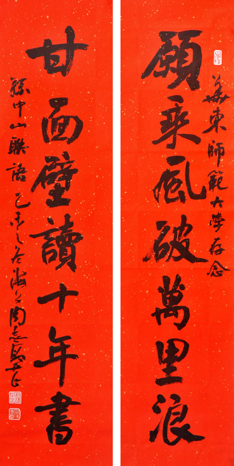 为华东师范大学书孙中山联语: 愿乘风破万里浪,甘面壁读十年书。